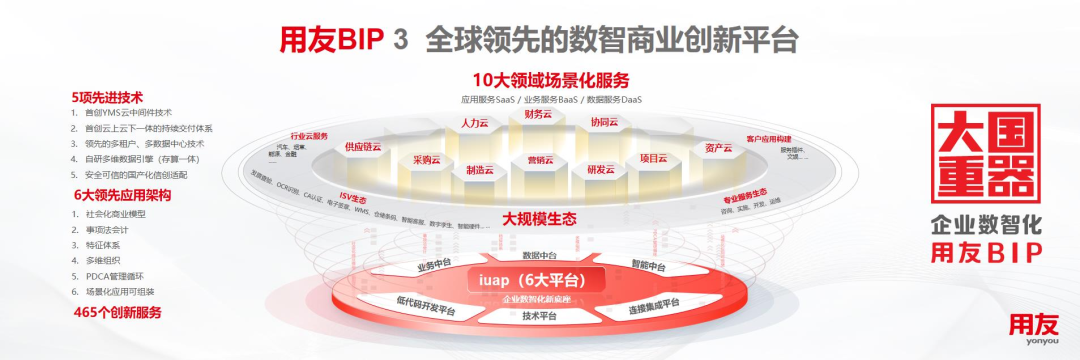 面對難得的市場和產(chǎn)業(yè)發(fā)展機(jī)遇,用友經(jīng)過6年的規(guī)模研發(fā)、持續(xù)迭代,以全新理念、全新技術(shù)、全新架構(gòu)、全新模式打造了面向企業(yè)和公共組織數(shù)智化的全新一代產(chǎn)品——用友BIP,并在平臺(tái)技術(shù)、應(yīng)用架構(gòu)、創(chuàng)新服務(wù)等方面實(shí)現(xiàn)多項(xiàng)重大突破與升級(jí),達(dá)到全球水平,包括5項(xiàng)技術(shù)、6大應(yīng)用架構(gòu)、465項(xiàng)創(chuàng)新服務(wù),覆蓋智能財(cái)務(wù)、數(shù)智人力、數(shù)智采購、數(shù)智營銷、智能制造、數(shù)智供應(yīng)鏈、數(shù)智研發(fā)、數(shù)智項(xiàng)目、數(shù)智資產(chǎn)及協(xié)同工作等十大核心領(lǐng)域,是目前全球領(lǐng)域覆蓋較多的企業(yè)云服務(wù)群。
